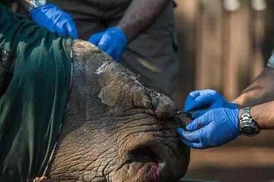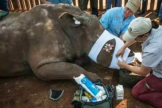 当工作人员走进观察想知道这是什么动物时,赫然发现这是一头犀牛。犀牛身上有多处伤口,眼睛被人打伤,而且最标志性的那根犀牛角也给人切除了下来,看起来非常虚弱。工作人员看到这个情况怒骂,并把犀牛送到动物中心救护。